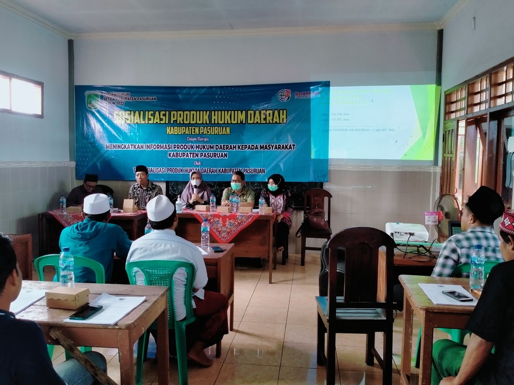 Kegiatan ini bertempat di Gedung Madrasah  Darunnajah Curahrejo Kecamatan Sukorejo Kabupaten Pasuruan yang di mulai pukul 07.30 WIB-selesai. Dalam kegiatan yang dimoderatori oleh Sub-koordinator sub-substansi Dokumentasi dan Informasi pada Bagian Hukum Adhe Wulan ini menghadirkan narasumber dari Bapemperda DPRD Kabupaten Pasuruan, Dinas Sosial Kabupaten Pasuruan dan Dinas Kesehatan Kabupaten Pasuruan dengan materi Perda Kabupaten Pasuruan Nomor 12 Tahun 2019 tentang Program Jaminan Kesehatan Daerah dan Perda Kabupaten Pasuruan Nomor 44 Tahun 2020 tentang Mekanisme Penyelenggaraan Program Jaminan Kesehatan Daerah di Kabupaten Pasuruan.